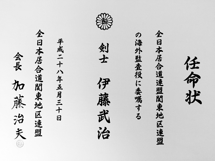 This is the “ZNIR Kansayaku commission” certificate granted by Kato Haruo Sensei, Vice President of the ZNIR (All Japan Iaido Federation). The ZNIR Kansayaku (Overseas Surveillance Auditor) has the direct authority to enforce ZNIR regulations, including: reporting, expelling or excommunicating any member or local dojo, as well as giving out corrections to enforce appropriate ZNIR regulations.